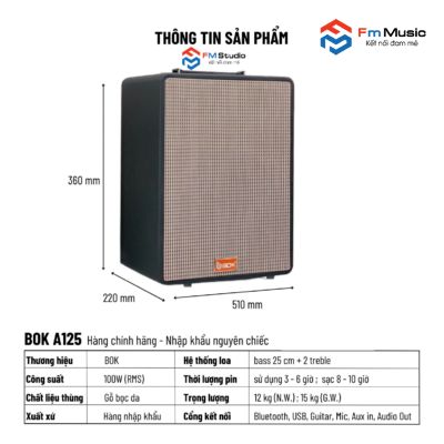 Loa karaoke xách tay mini BOK A-125 được thiết kế thùng gỗ bọc da tinh tế, nhỏ gọn với gam màu đen đơn giản nhưng vẫn tạo nên vẻ sang trọng. Ngoài ca hát và nghe nhạc, BOK A-125 có thể được sử dụng như một món đồ trang trí cho không gian sống thêm sinh động.